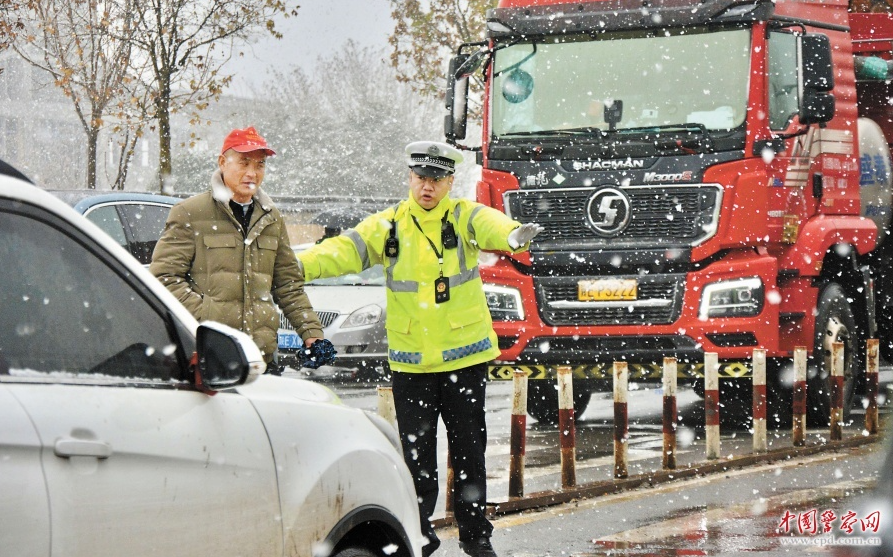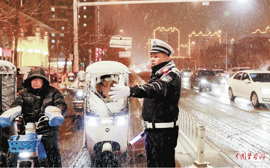 12日,河北省沧州市公安局交警支队民警冒雪开展疏堵保畅工作,筑牢道路交通安全防线。孔大龙 摄