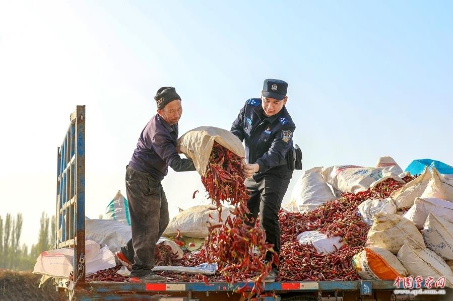 11月25日,新疆维吾尔自治区巴楚县公安局恰尔巴格乡派出所组织民警辅警来到辖区辣椒种植园,帮助群众采摘辣椒。其间,他们结合农村常见的诈骗案例,给种植户讲解防骗知识,全力守好群众“钱袋子”。邓韬 摄