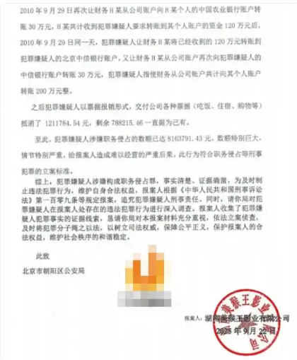 《报案书》显示,2010年7月,张纪中受聘担任公司总经理,在当年的7月至12月期间,多次指挥财务从公司账户向其个人账户进行转账,金额较大,且这些款项与工作无关,也未进行合法报销。公司认为,张纪中的上述行为属于职务侵占行为。