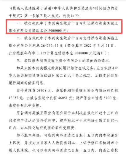 湖南美猴王影业向潇湘晨报记者提供的法院判决书显示,经浙江省杭州市余杭区法院一审判决、杭州市中级人民法院二审判决以及浙江省高级人民法院再审裁定,被告张纪中向原告湖南美猴王影业有限公司归还借款本金500万元及相应利息。