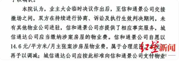 红星新闻记者在判决书中看到,一审法院认为,信和通景物业并非最高院物业司法解释中规定的“未提供物业服务”之情形,业主大会作出临时决议后,到物业公司与业委会完成交接前,这段时间一直处于双方协商、诉讼及判决执行过程中,应视为信和通景公司在此期间仍在为小区提供事实上的物业服务,因此业主应当缴纳截至物业公司与业委会实际交接之日的物业费。