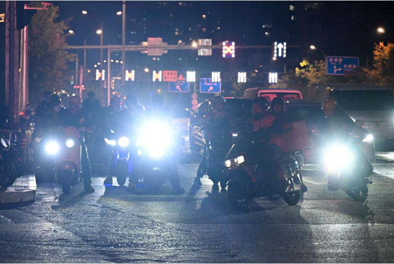 11月14日,在上海市郊一处路口,部分电动自行车的车灯令人眩目。