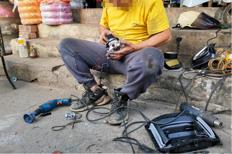 11月27日,在广西南宁市一处电动自行车零配件市场内,工作人员对电动自行车车灯进行改装。