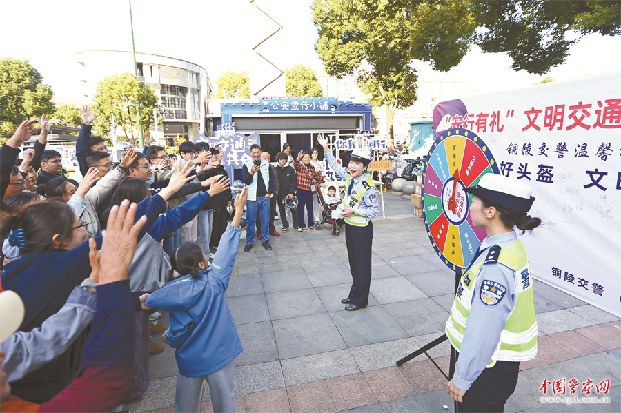 10月24日,安徽省铜陵市公安局交警支队在万达广场开展“安行有礼”文明交通主题宣传活动,吸引众多市民群众参与。图为民警通过有奖竞答的方式与群众互动,引导大家自觉遵守交通安全法律法规,文明参与交通。潘 峰 摄