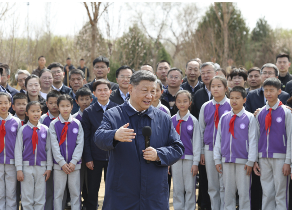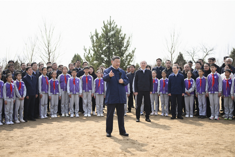 3月30日,党和国家领导人习近平、李强、赵乐际、王沪宁、蔡奇、丁薛祥、李希等来到北京市昌平区百善镇参加首都义务植树活动。这是习近平同在场的干部群众、少先队员亲切交谈。新华社记者 燕雁 摄