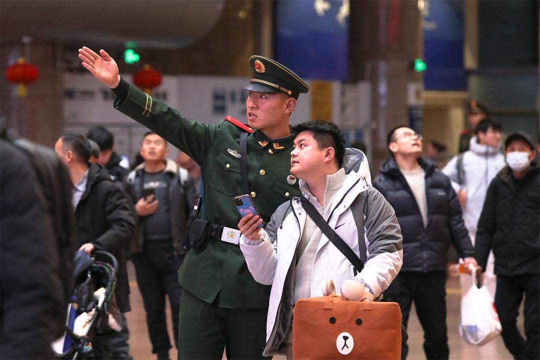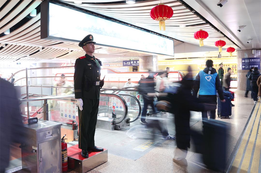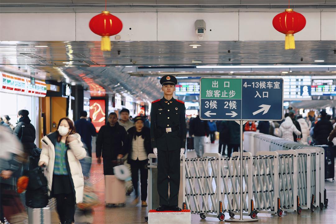 今年春运期间,各地交通枢纽陆续迎来探亲返乡出行高峰。作为重要交通枢纽之一的北京西站客流攀升明显,站内人潮涌动。连日来,武警北京总队执勤第六支队官兵坚守一线,在车站各重点区域全时值守,以挺拔身姿维护现场秩序,全力筑牢春运期间出行安全屏障。
