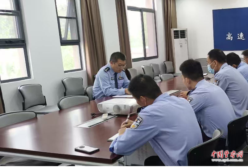 2023年“五一”小长假前夕,苗海滨(左一)就高速出行大流量应对、勤务安排、安全防护等工作进行强调部署。(资料图片)