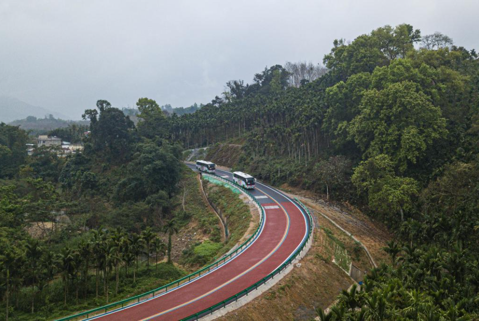 2025年2月21日,观光巴士行驶在海南环热带雨林国家公园旅游公路琼中段(无人机照片)。新华社记者 蒲晓旭 摄
