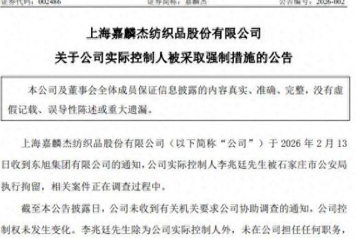 2月13日晚,嘉麟杰(002486.SZ)公告称,公司于当天收到东旭集团有限公司的通知,公司实际控制人李兆廷被石家庄市公安局执行拘留,相关案件正在调查过程中。截至本公告披露日,公司未收到有关机关要求公司协助调查的通知,公司控制权未发生变化。李兆廷除为公司实际控制人外,未在公司担任任何职务,公司董事和高级管理人员均正常履职,公司生产经营一切正常,上述事项不会对公司正常生产经营产生重大影响。