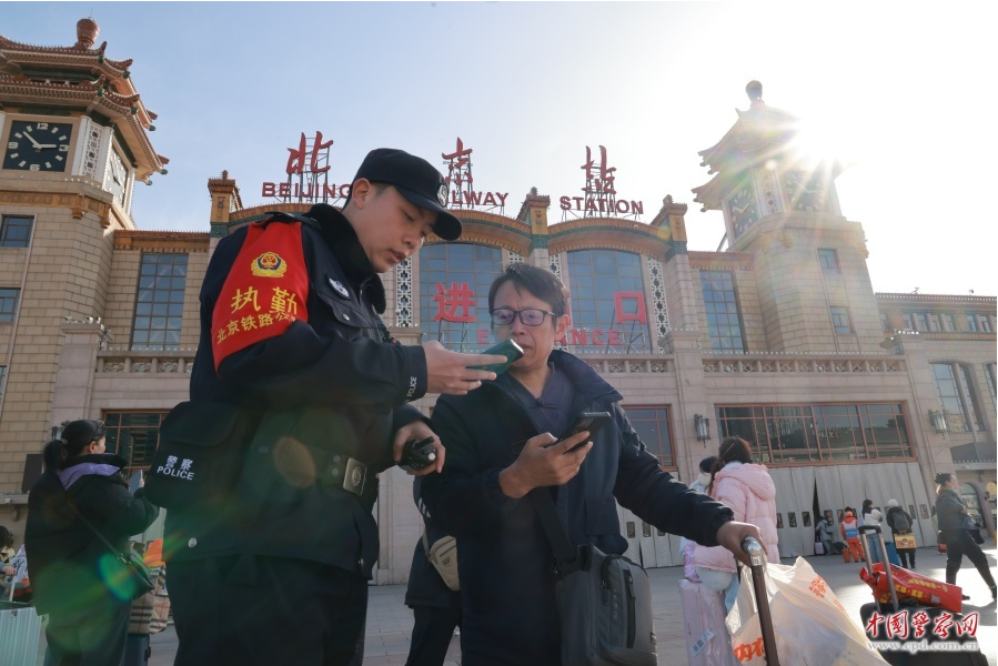民警在北京站广场服务旅客。张铮 摄