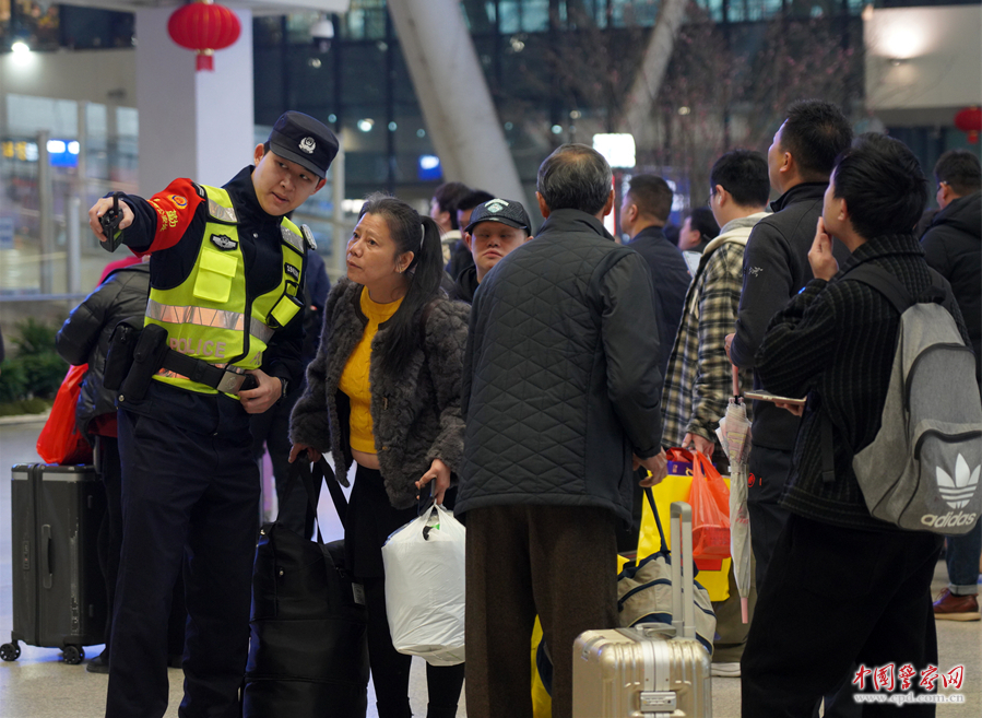 2月23日,武汉铁路公安局提前与武汉客运段对接,及时掌握客流变化,完善各类紧急预案,全力应对返程高峰。图为民警给旅客指引乘车方位。李鹏翔 摄