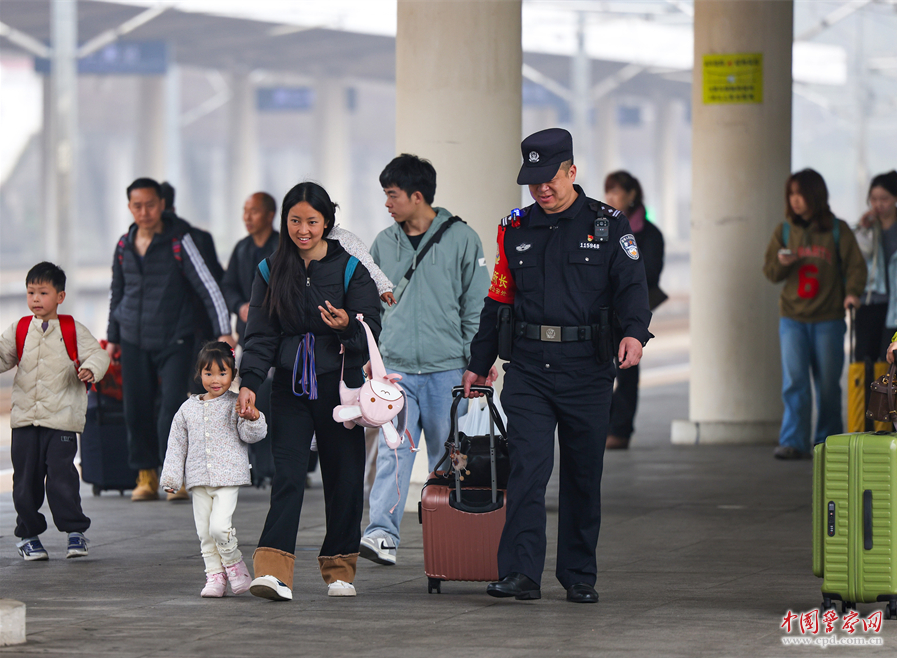 2月23日,成都铁路公安局贵阳公安处铜仁南车站派出所优化警力部署,为旅客提供贴心服务,保障旅客平安返程。图为民警帮助旅客搬运行李。胡攀学 摄