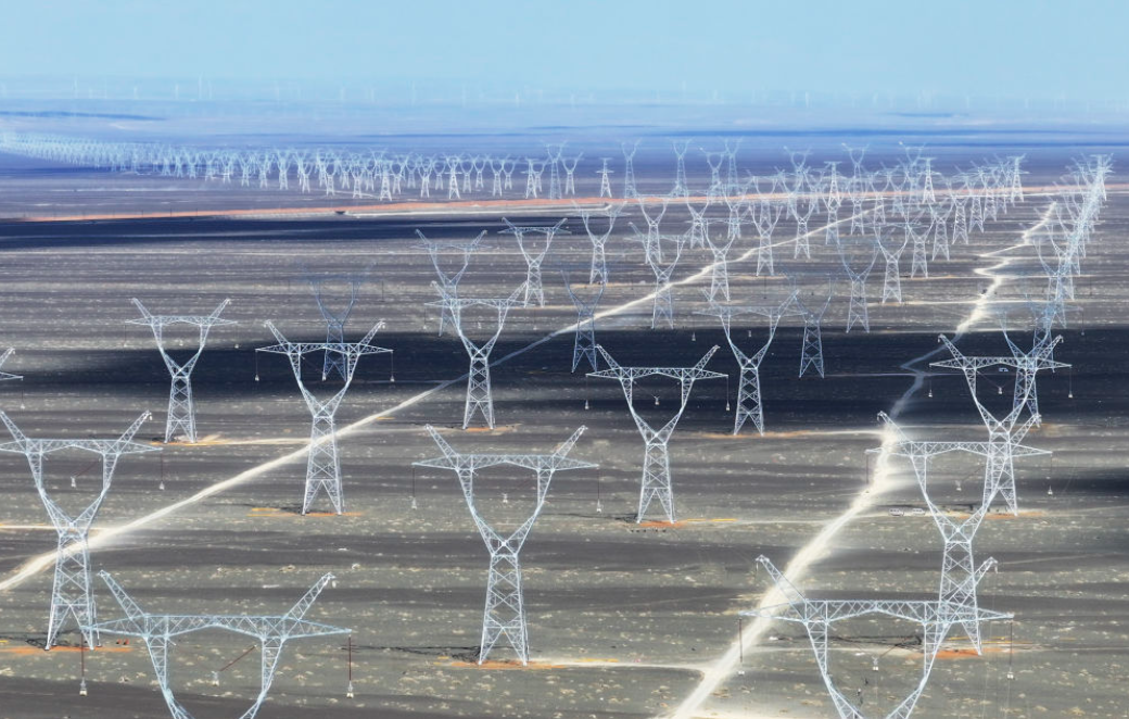 这是2025年4月24日在新疆哈密地区三塘湖镇附近拍摄的“疆电入渝”特高压工程(无人机照片)。新华社记者 王菲 摄