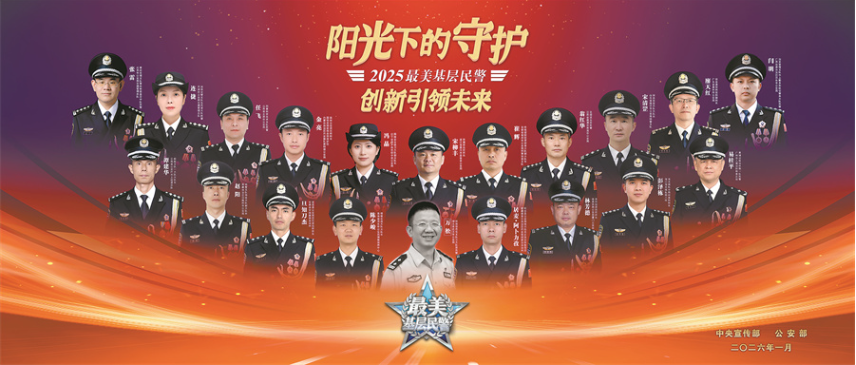 1月26日,由中央宣传部、公安部共同录制的《闪亮的名字——2025“最美基层民警”发布仪式》在中央广播电视总台央视综合频道(CCTV-1)播出,20位“最美基层民警”的风采事迹亮相央视舞台。