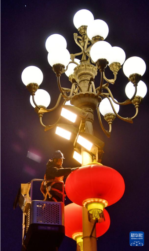 2月11日,工人在巡检长安街的大红灯笼。