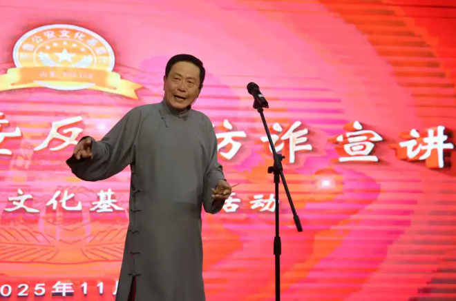 ▲山东省曲艺名家带来的山东快书经典选段,铿锵的鸳鸯板敲打出岁月的回响,更在传统艺术的独特韵味中,织入了现代防诈的智慧经纬,引得掌声如潮,经久不息。