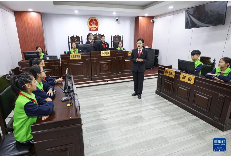 12月2日,在山东省荣成市人民法院民事审判庭,法院工作人员指导学生沉浸式体验“模拟法庭”。