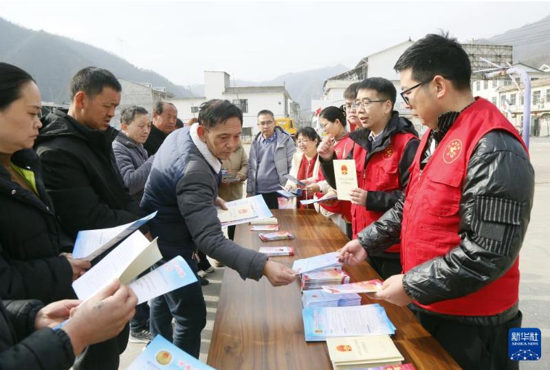 12月2日,在河南省洛阳市汝阳县付店镇马庙村,县法律援助中心、公正处、司法所志愿者给群众讲解宪法知识。