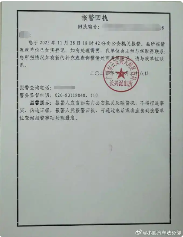 来源:@小鹏汽车法务部、广州天河公安