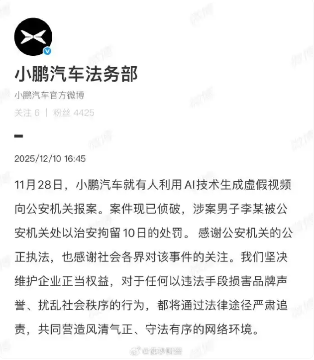 11月28日,小鹏汽车就有人利用AI技术生成虚假视频向公安机关报案。案件现已侦破,涉案男子李某被公安机关处以治安拘留10日的处罚。感谢公安机关的公正执法,也感谢社会各界对该事件的关注。我们坚决维护企业正当权益,对于任何以违法手段损害品牌声誉、扰乱社会秩序的行为,都将通过法律途径严肃追责,共同营造风清气正、守法有序的网络环境。
